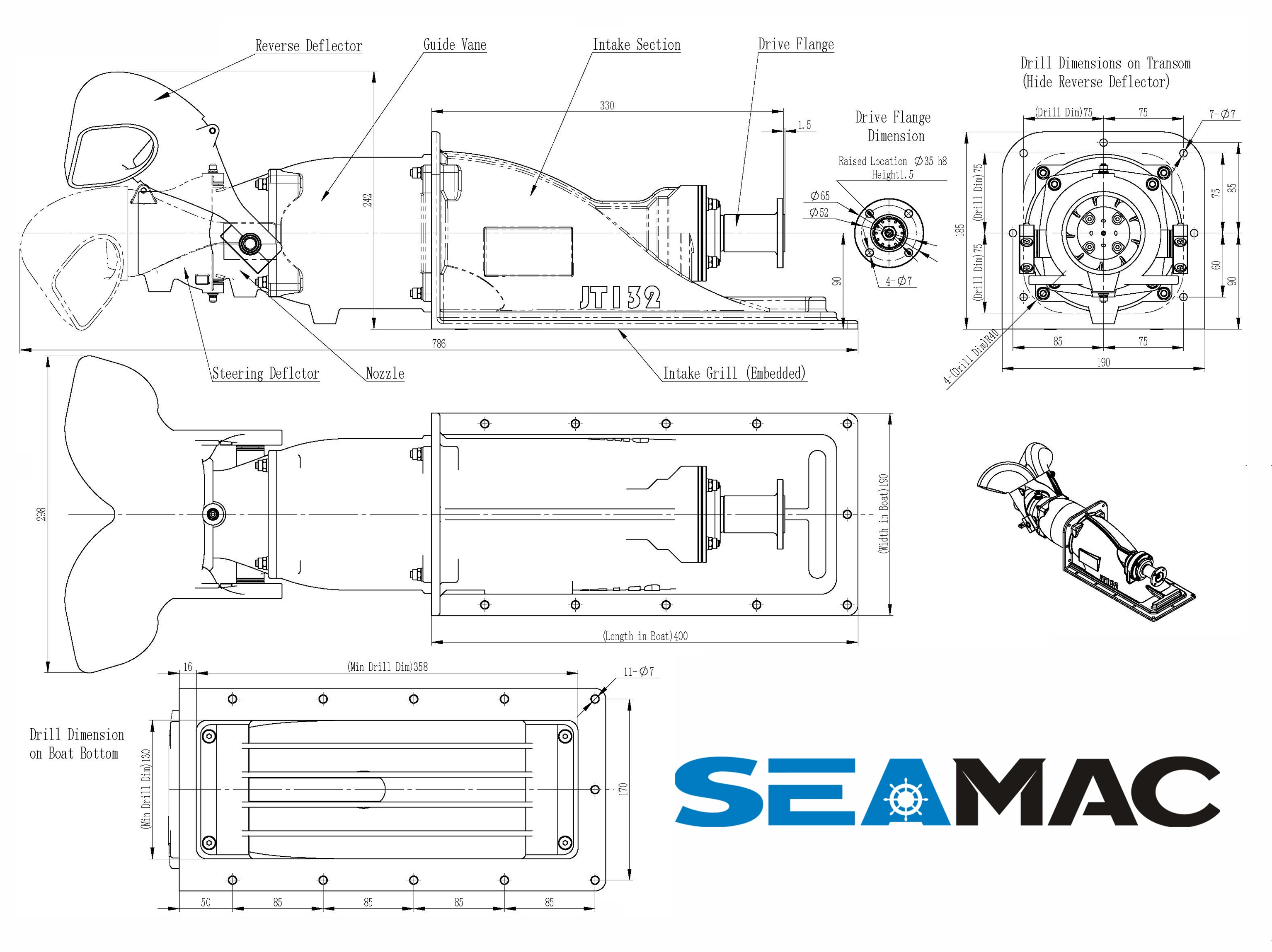The JT132 marine jet pump features an input speed range of 2000 – 6000 RPM, 130 mm impeller diameter, 70 mm nozzle diameter, and 1.5 – 40 kW (2 – 53 hp) power capacity. It achieves optimal performance through a single – stage axial flow design with dual – channel reversing buckets for efficient thrust control. The compact 786 x 298 x 185 mm housing is constructed from corrosion – resistant aluminum alloy, while critical components like the impeller and shaft utilize marine – grade stainless steel.