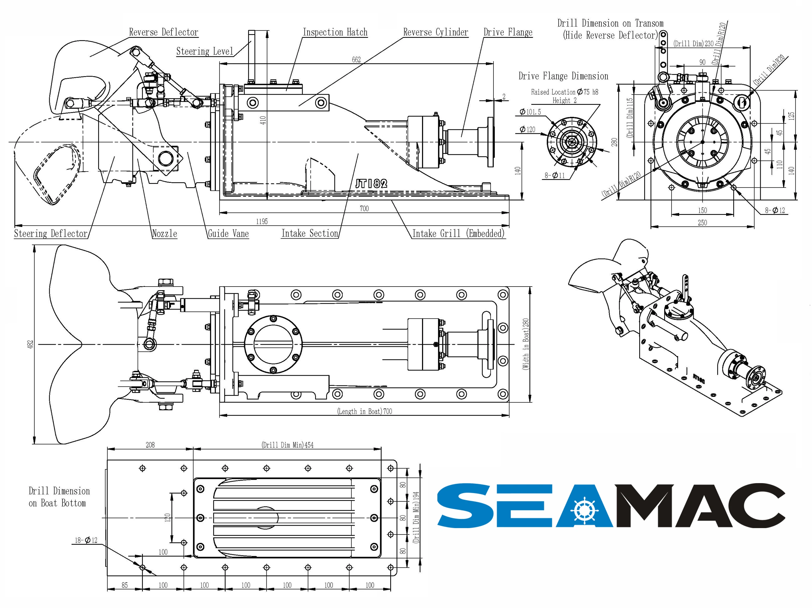 The JT182 is a single – stage axial – flow marine jet pump. It has an input power range of 5 – 222 kW (6.7 – 298 hp) and input speed of 2000 – 4000 rpm. The impeller diameter is 180 mm, and nozzle diameter is 120 mm (4.7 inches). The pump housing is made of aluminum alloy, while the spindle and impeller are of stainless steel.