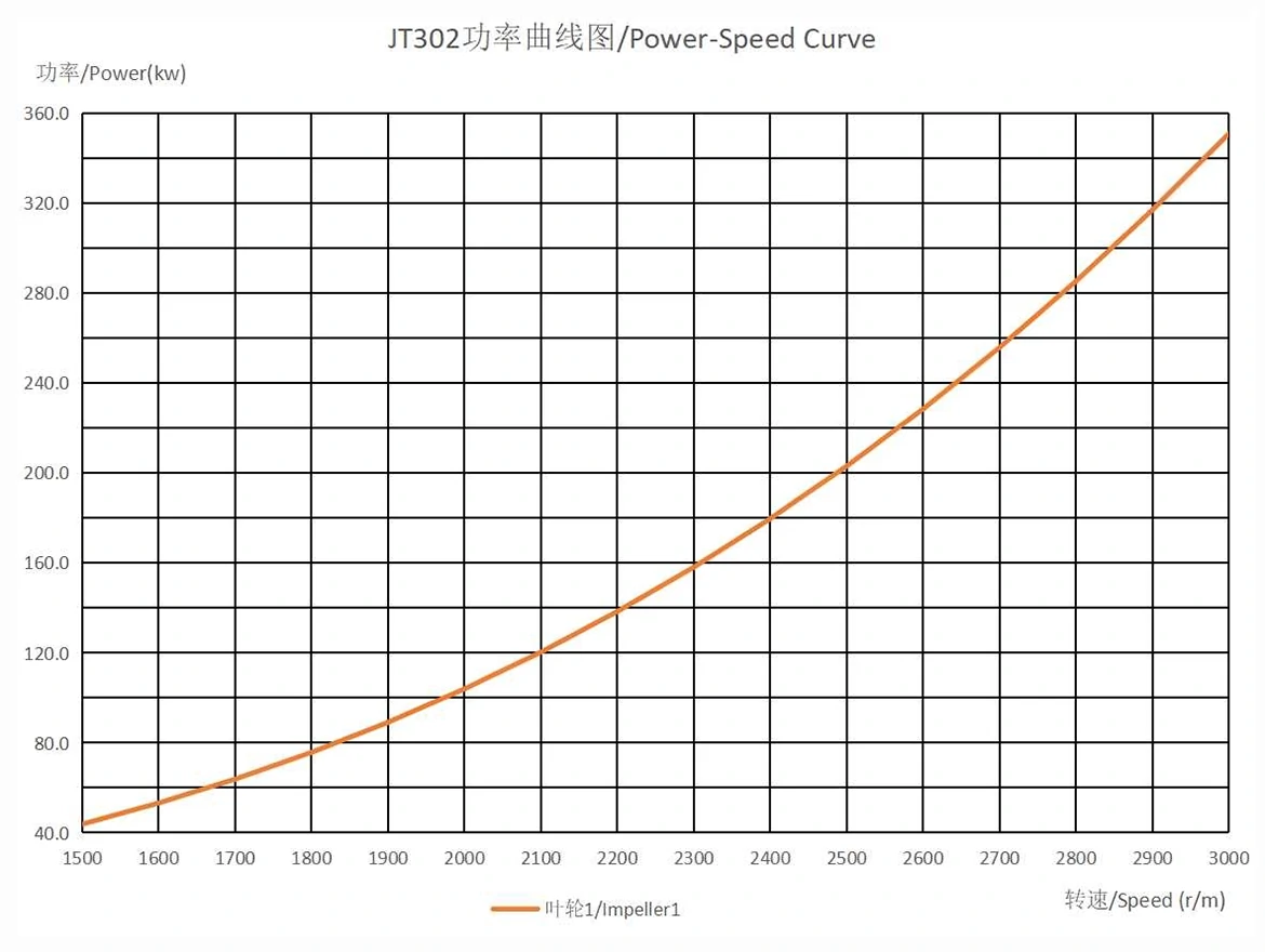 The JT302 is a single – stage axial – flow marine jet pump for yachts, workboats, and patrol boats. It has an input power range of 44 – 351 kW (59 – 471 hp) and an input speed range of 1500 – 3000 rpm. Rotating clockwise when seen from the coupling, it has a 305 – mm impeller diameter and 170 – mm (6.7 – inch) nozzle diameter. The pump housing is made of aluminum alloy, and the spindle and impeller are of stainless steel.